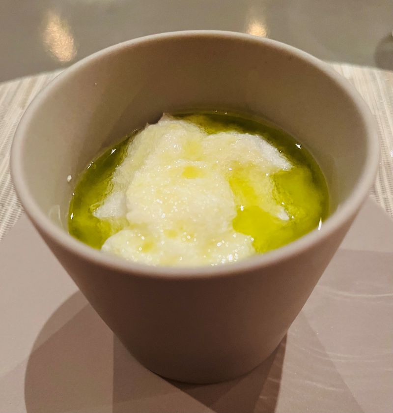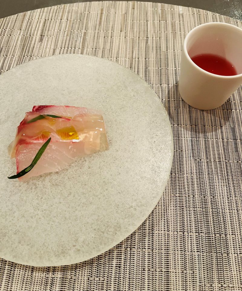 素晴らしい技術によって、最高の状態のお魚の上には、糠漬けの液体をジュレ状にした半固形ソースがかかり、光を受けてきらきらと美しく輝いています。添えられたエストラゴンはお庭から摘んだものだそう。あまり見かけないハーブなので、自由が丘でも育つなら、私も植えてみようかしら、と思いました。