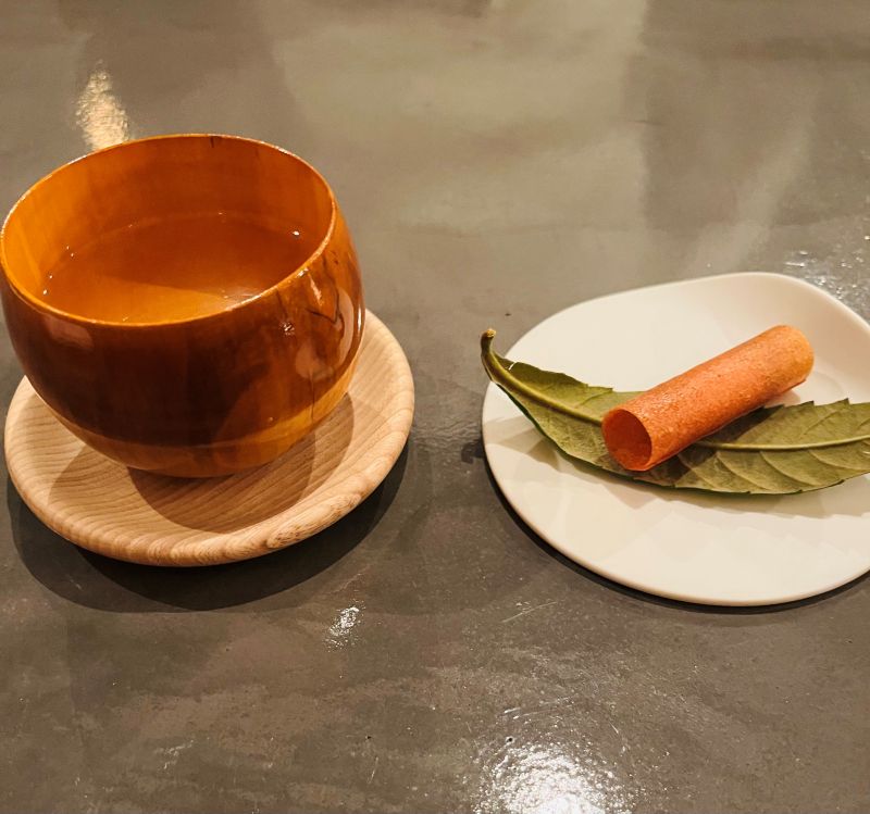 小さなカップに添えられたのは、その日の料理に使った野菜をサイフォンで抽出した温かいブロード。静かに、じんわりと、野菜の美味しさが体に染みていきます。