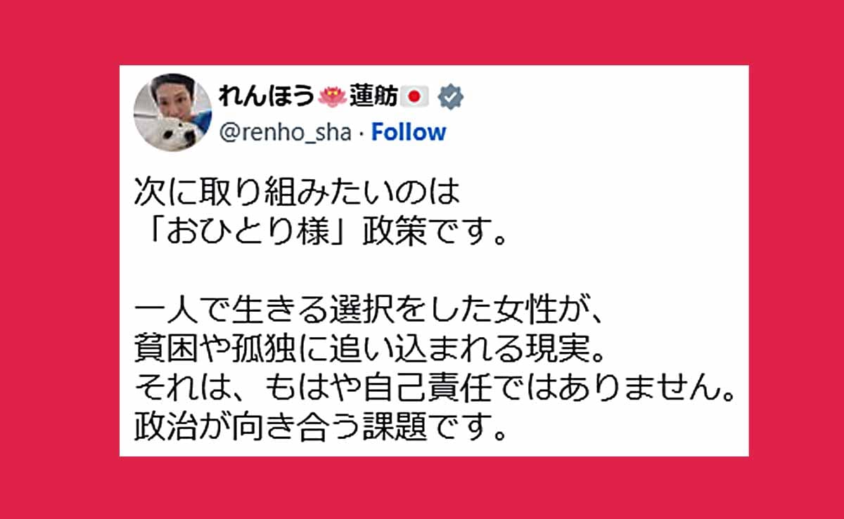 立憲民主党の蓮舫氏がX(旧ツイッター)に投稿した「おひとり様」政策をめぐり、与野党支持層やSNS上で批判が広がっている。単身女性支援を前面に出した政策提起が、公平性などの観点から反発を招いている。