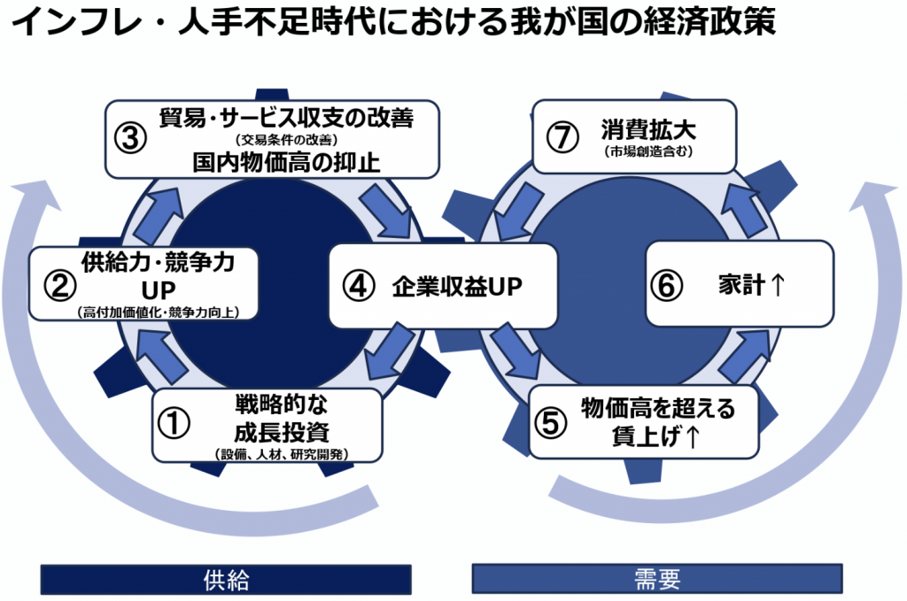 現在、多くの方々が急激な物価上昇に不安を感じています。この課題を根本から解決するには、単なる家計支援だけでなく、「供給力と競争力の強化」が不可欠です。効率的な物流、エネルギーの安定供給、そして生産性を高めるための設備投資、研究開発を増やし競争力を高めることで海外への輸出を増やす。これらを加速させることで、物価上昇を適正な水準に落ち着かせると同時に、少ない人数でこれまで以上に利益を上げることができる強い経済を目指していきます。