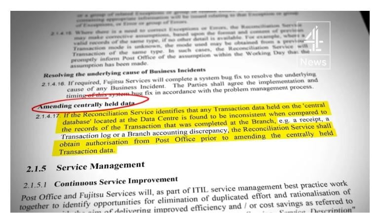 チャンネル4のアレックス・トムソン記者によれば、ここには富士通が郵便局の指示により、支局長の口座データを中央から修正できることが明確に記載されている。