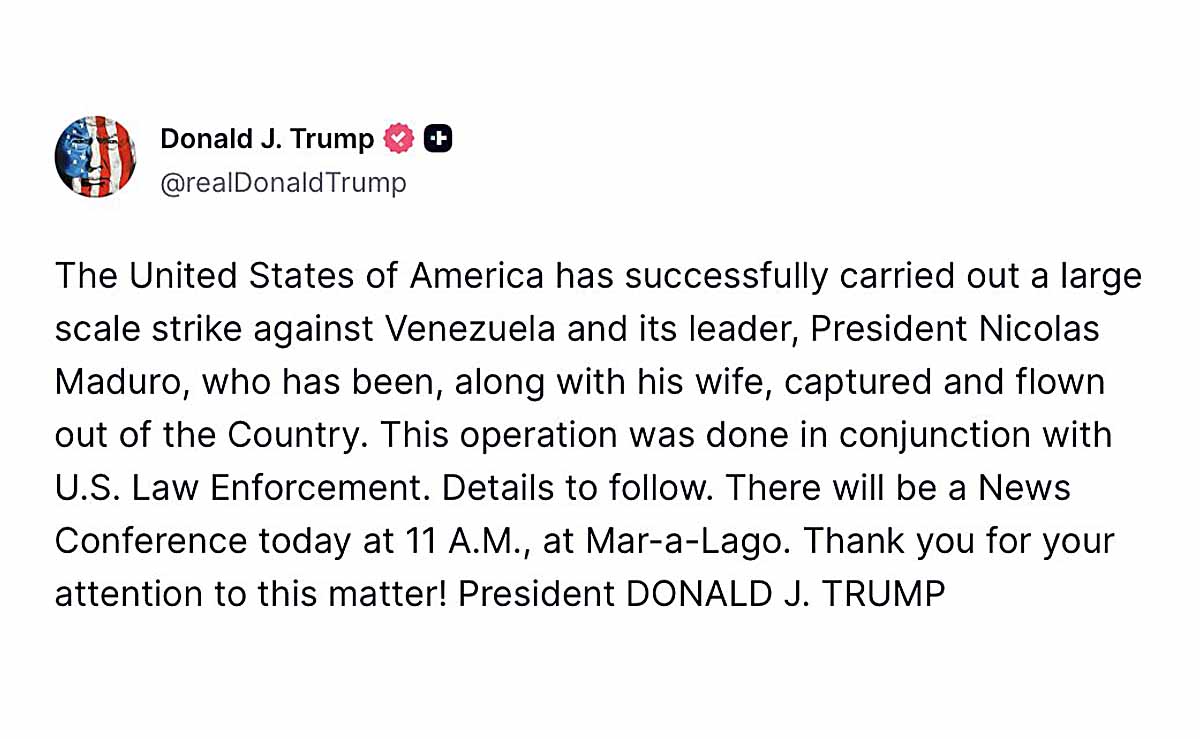 この急襲によりマドゥロ大統領夫妻の身柄が拘束されたとのことです。
