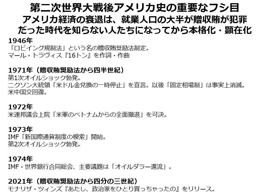 1946年にアメリカ連邦議会が、議会に登録されたロビイストを通じてであれば、だれでも合法的に政治家たちに賄賂を贈ることができる「ロビイング規制法」という名の贈収賄奨励法を制定しました。