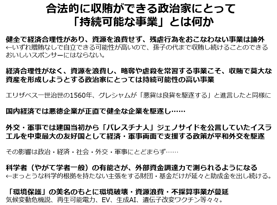 贈収賄奨励法の悪影響は、国内の政治・経済・社会にも、外交・軍事における無法国家の全面支援にとどまるわけではありません。特定の利権集団に効率よく奉仕する政治家こそ有能な政治家だという評価が定着すると、学術研究者の評価も歪曲されます。