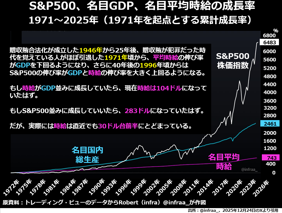 勤労者の賃金給与増加率がGDP成長率や株価の上昇率に遠く及ばないことは、次のグラフが証明しています。