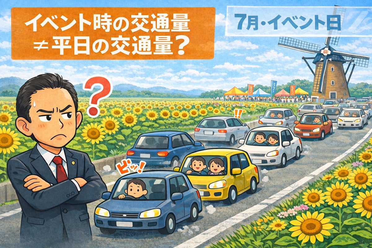 市は、先に示した「47万人」の算出に際し、7月のひまわり開花期・休日の交通量調査を基礎に、平日・休日の利用者数を推計し、さらに将来増加分としてイベント来場者数を加算している。
