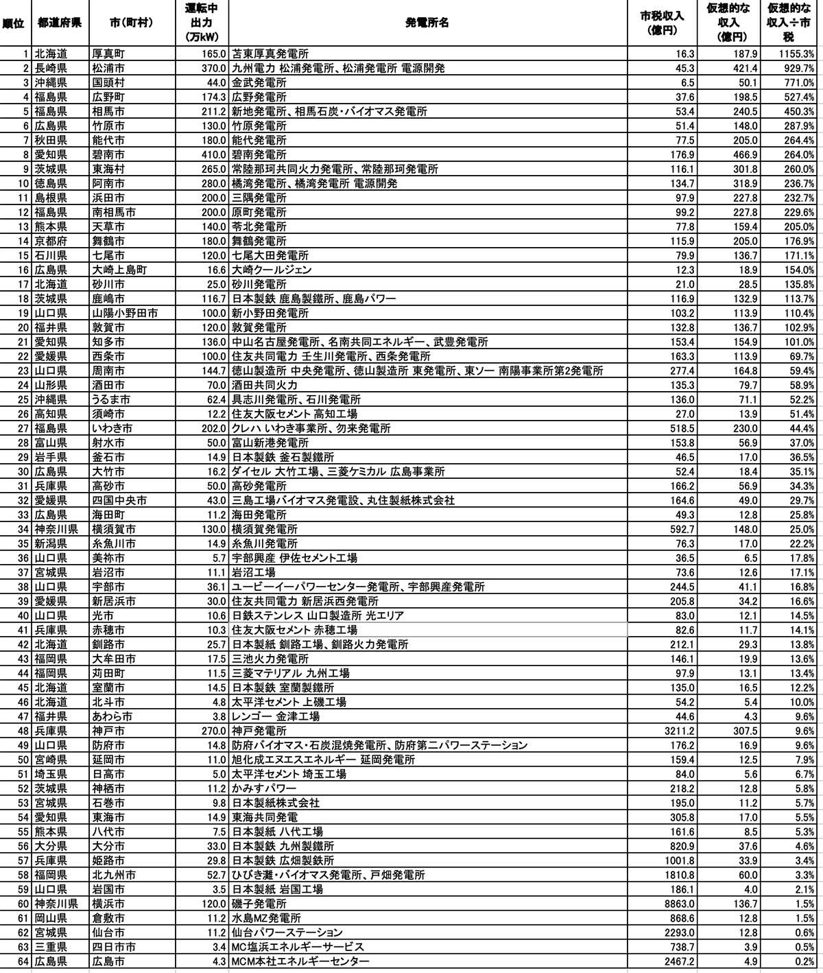 そして発電所ごとに計算された「仮想的な収入」を、その発電所が立地している市(ないし町村)の市税収入と比較して、両者の比である「仮想敵な収入÷市税」を指標としてランキングをする。