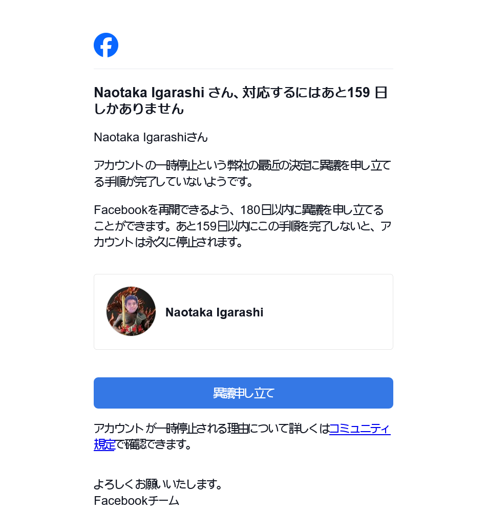 ところが12/18、何かにコメント入力中に突然アカウント停止された。画面がチラチラしたと思ったらアカウント停止画面。もちろん即座に異議申し立てしたが、通常一日強で審査とあるのに、何日たっても全く審査の気配も連絡もない。