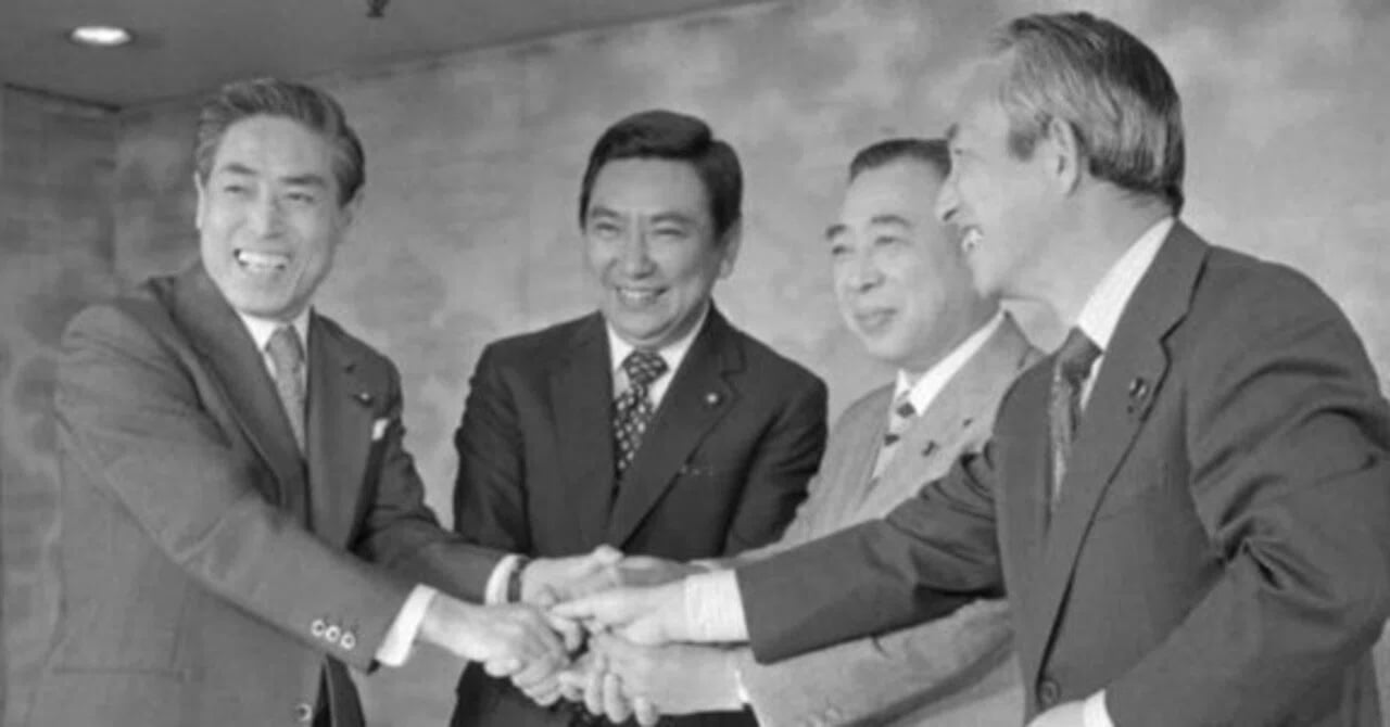 (ヘッダーは1978年5月、中道4党での協力を約す民社・佐々木良作、新自ク・河野洋平、公明・竹入義勝、社民連・田英夫。時事通信より)