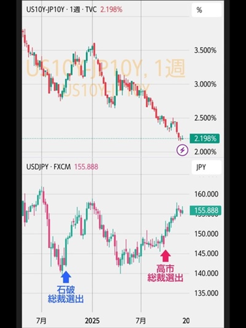 ・補正の規模と国債増発観測が長期金利を押し上げ(需給悪化)、短期は円安圧力。逆に、BOJが利上げ再開を示唆/実施、または実弾介入が入れば急反落レンジに移行