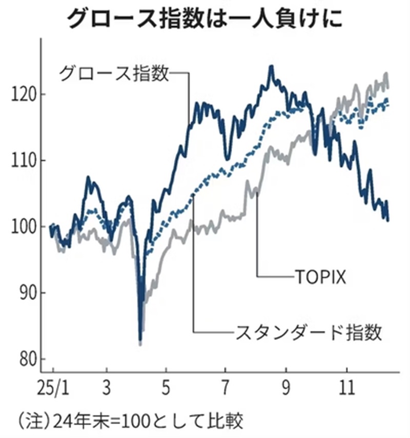 当たり前と言えば当たり前。グロース市場にはグローバル企業の比率は非常に低いのが現状です。多くの企業は国内向けのITサービスやスタートアップが中心なので円安の恩恵を受けないので株価が上がらないだけだと思います。高市さんの積極財政が評価されて株価が上がるなら、グローバル企業以外の、特にスタートアップ中心のグロース株が絶不調なのはおかしいでしょう。