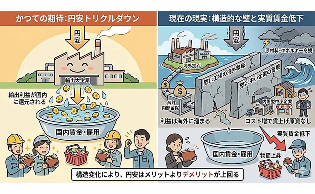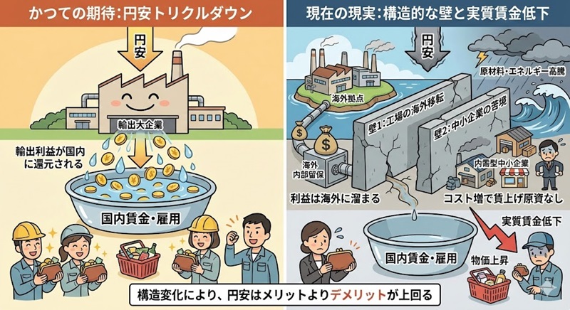 かつては「円安は輸出企業を儲けさせ、それが賃金として還元される(トリクルダウン)」というメリットが強調されたが、現在はそのメリットよりもデメリット(物価上昇による購買力の低下)が上回る構造になった。