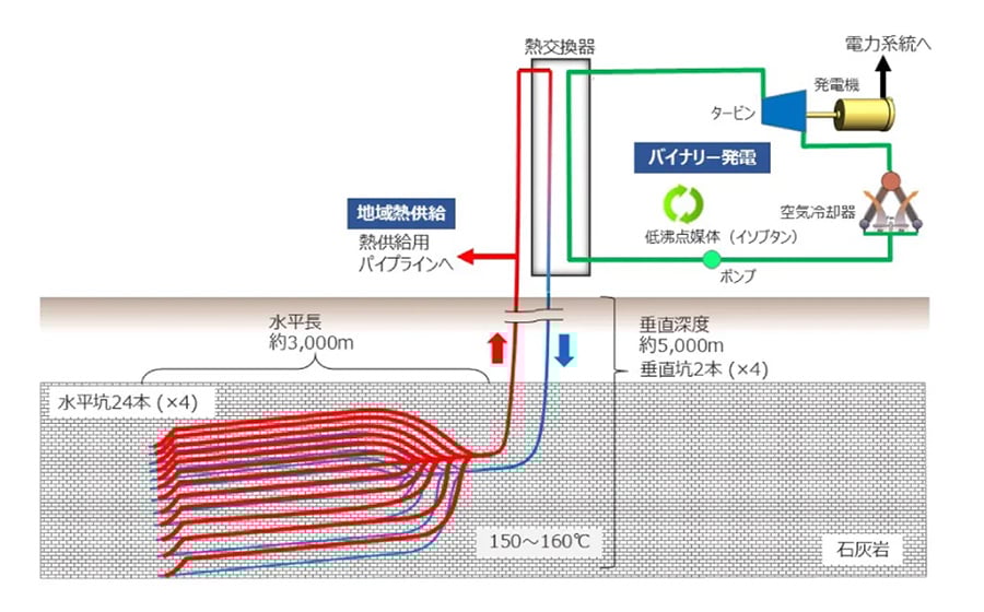 もう1つの「クローズドループ」については、岩盤に熱は存在するものの蒸気貯留層がないため、高温高圧の蒸気を直接取り出すことができない。そのため、図2のように深部地層内で水平に長い井戸を複数本掘り進め、さらに先端部分で折り返してループ状にする。そのパイプ内に水を注入し、地熱で加熱した後に地上へ回収する仕組みである。地上で熱を取り出した水は再び注入され、同じ水を循環させることから「クローズドループ」と呼ばれる。