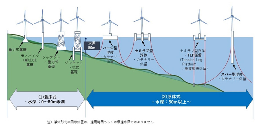 洋上風力は、海底に基礎を固定する着床式と、海上に基礎を浮かせて係留する浮体式に大別される。浮体式洋上風力は技術的難易度が高く、当時の欧州でも主流は着床式であった。しかし、日本近海は浅瀬が少ないため、着床式では導入量が限られるという理由から、実績の乏しい浮体式に一足飛びで挑戦する判断がなされた。