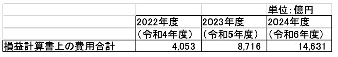 次に、決算の数字を見てみる。表3は、NEDOが公表している2022年度〜2024年度の財務諸表のうち、行政コスト計算書から「損益計算書上の費用合計」を抽出したものである(参照)。
