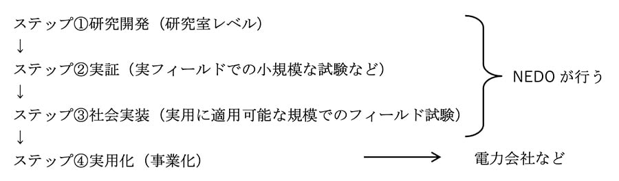 このうちNEDOが担うのは①~③であり、④の実用化・事業化は電力会社、地方自治体、メーカーなどが担う(事業スキームによってはこの限りではない)。