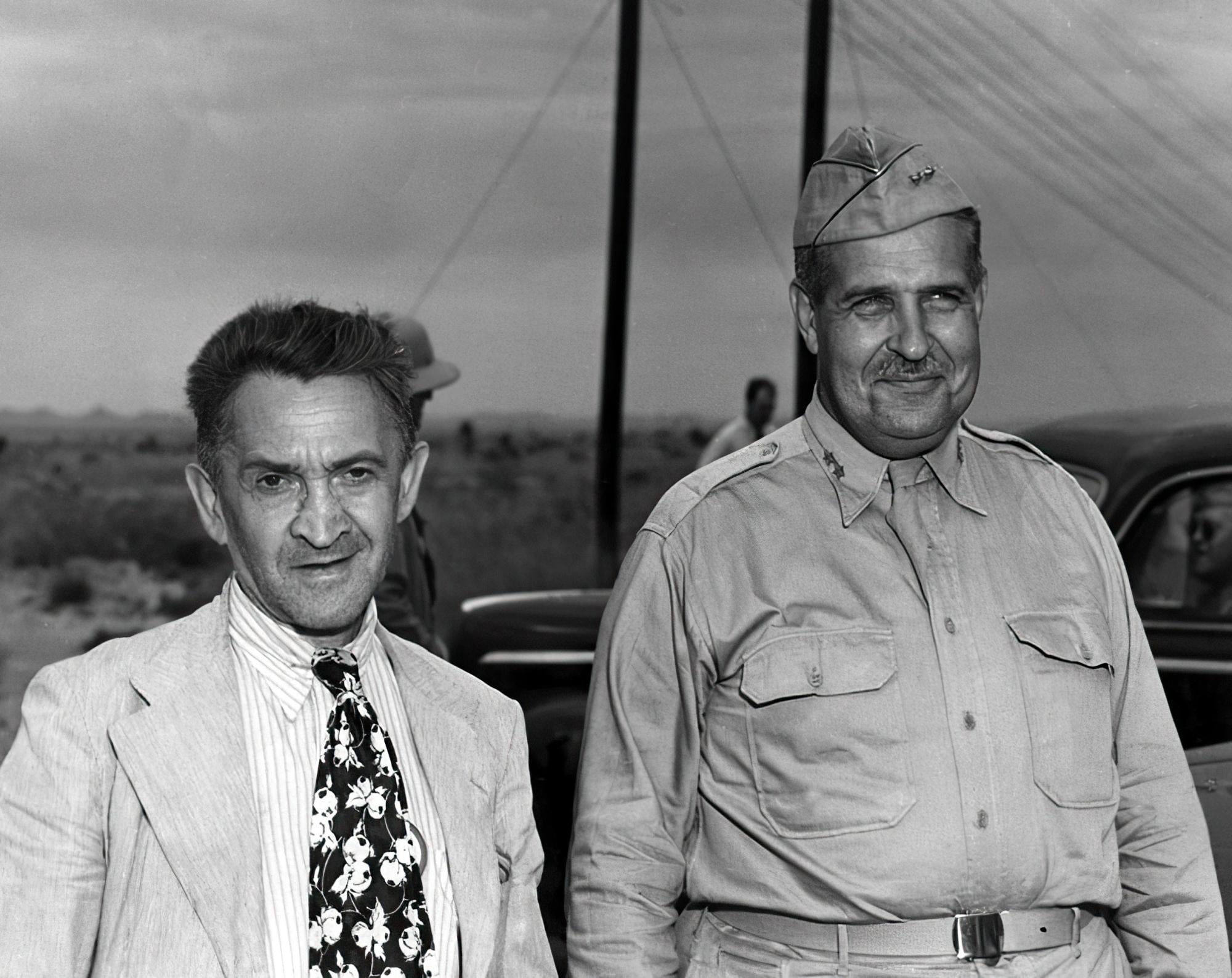 トリニティ実験後のプレスツアーにて。1945年9月。ローレンス(左)とグローブス(クレジット:U.S. Army Corps of Engineers)