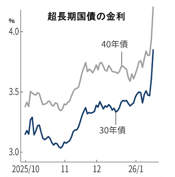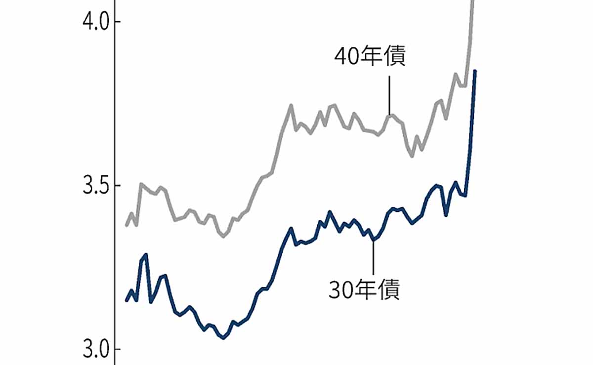 国債バブルの暴落が始まった。長期金利が急上昇し、きょう未明の段階で10年物国債が2.38%と27年ぶりの水準となり、40年物は4.215%と過去最高を記録した。