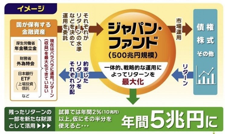 GPIFの資産は約250兆円、外為特会(外国為替管理特別会計)は約200兆円、日銀の保有するETF(上場投資信託)の評価額は90兆円で、合計540兆円です。これを一体運用して年1%の運用益を出せれば、年間5兆円程度の新たな財源が期待できる、というのが中道改革の説明です。