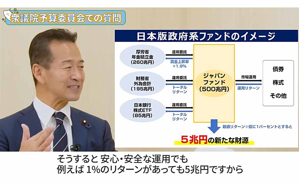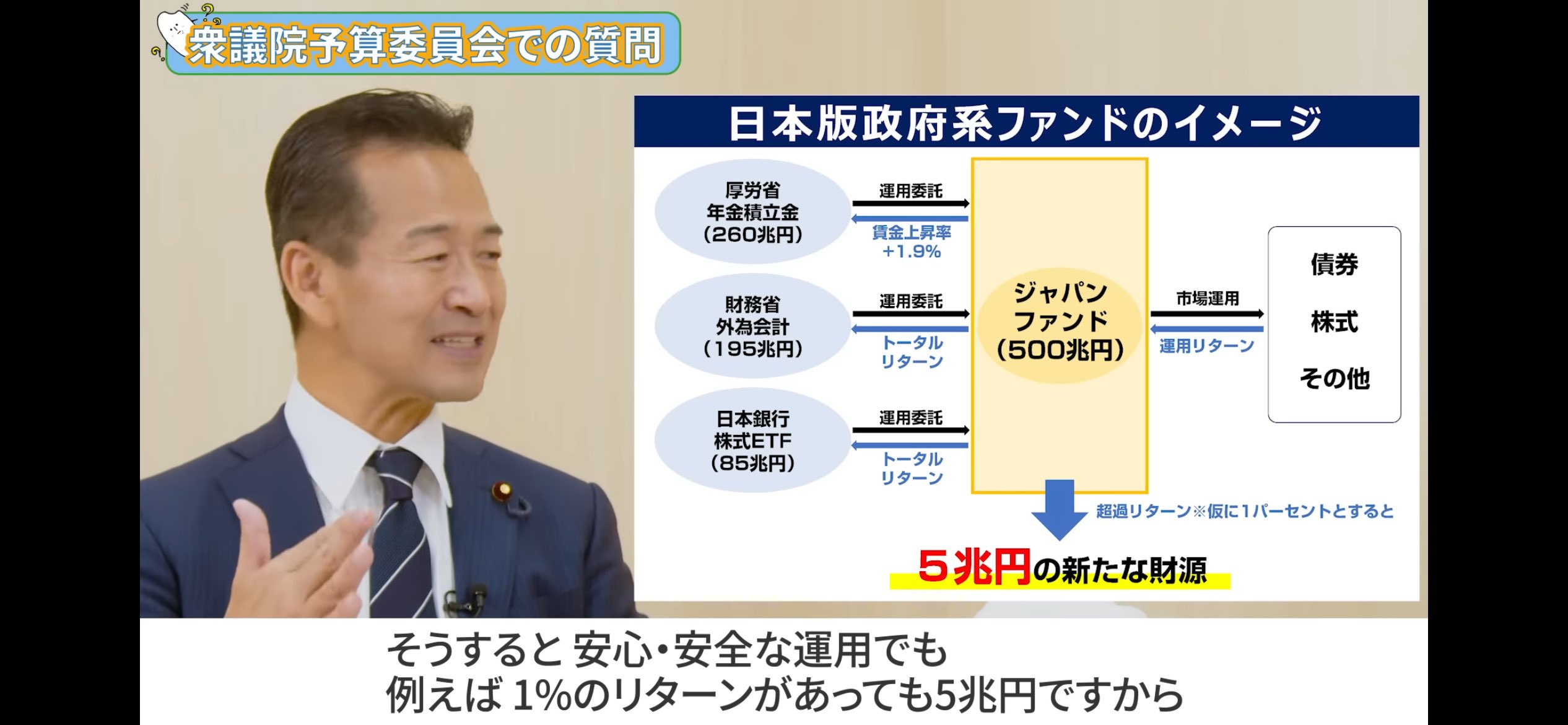 こうした実情を踏まえ検討委では、ジャパン・ファンドで公的部門の資産を一元管理し、GPIFに蓄積されたノウハウや人材を活用することで、新たな運用益を生み出したいと考えています。仮に500兆円を一体的に運用し、年1%の運用益が出れば、5兆円の新たな財源が生まれます。これは消費税の軽減税率をゼロにするほどのインパクトがあります。