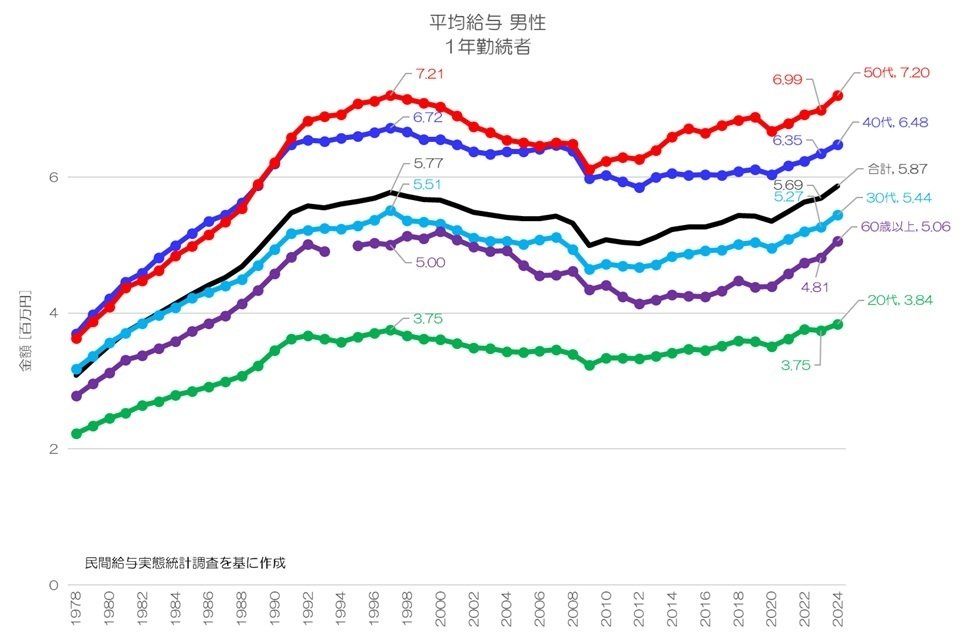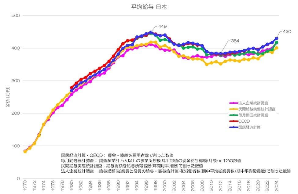 国民経済計算の数値で見れば、1997年で449万円となり、その後は減少傾向が続き2012年の384万円を底にして上昇傾向に転じ、2024年でも430万円で当時のピーク値を超えていません。