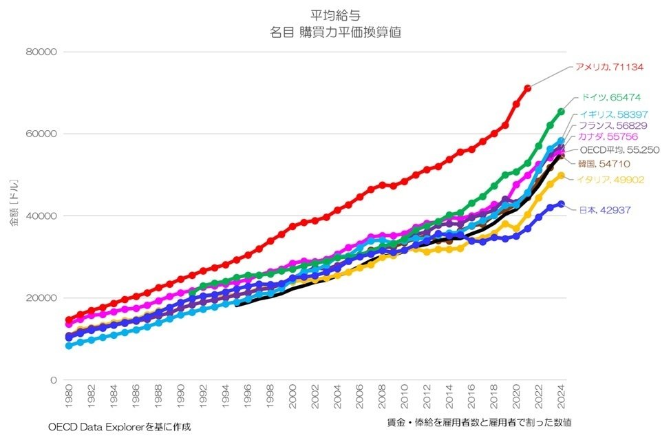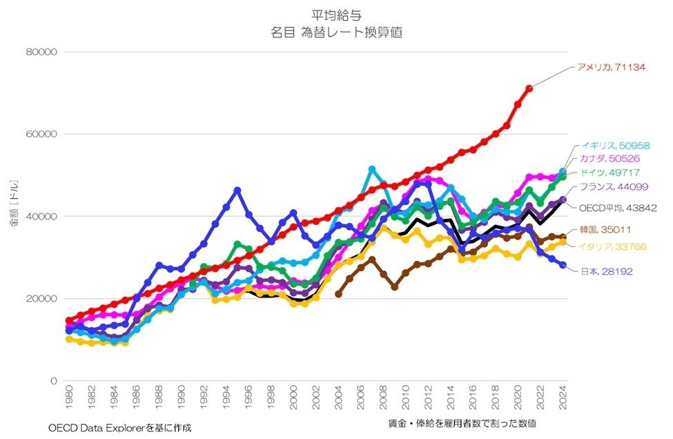 日本は28,192ドルで、OECD34か国中24位、G7最下位となっています。