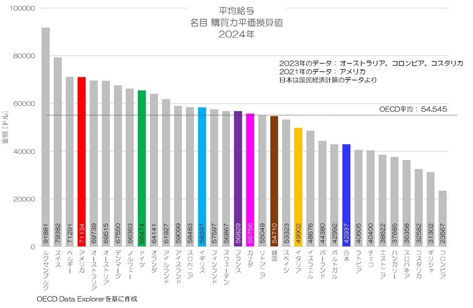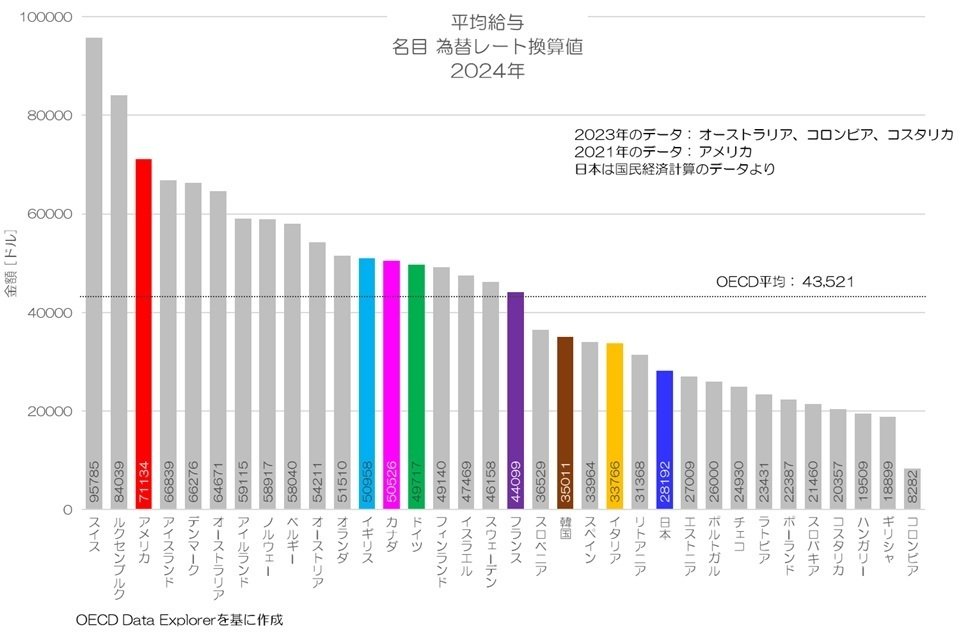 つづいて、平均給与の為替レート換算値について、最新の2024年の国際比較をしてみましょう。