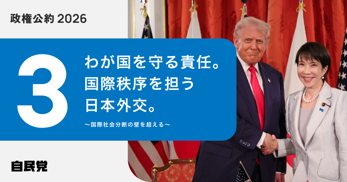- 自由、民主主義、法の支配といった価値やルールに基づく国際秩序を堅持し、国際社会の平和と安定に積極的に貢献します。力による一方的な現状変更の試みや経済的威圧への対応を抜本強化します。
