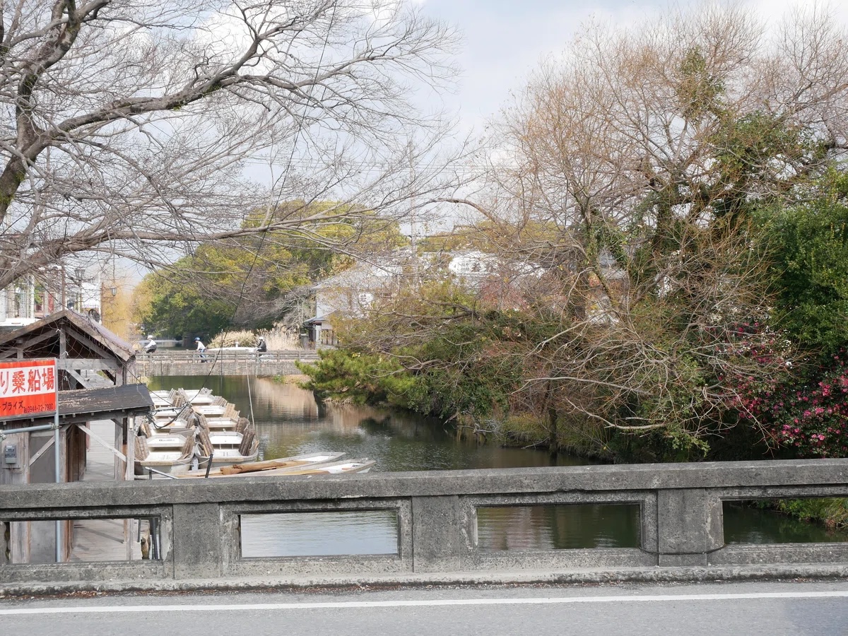 駅から町の中心部は歩いて15分から20分ほど離れています。さらに、観光の中核となる「御花」のあるエリアはその先でバスが駅と各エリアの間を結んでいるのですが、街をめぐる掘割の様子を見ながら歩けばそんな時間もあっという間です。いくつかの掘割の脇は遊歩道が整備されているので、散歩しながら「御花」エリアを目指すのもいいと思います。