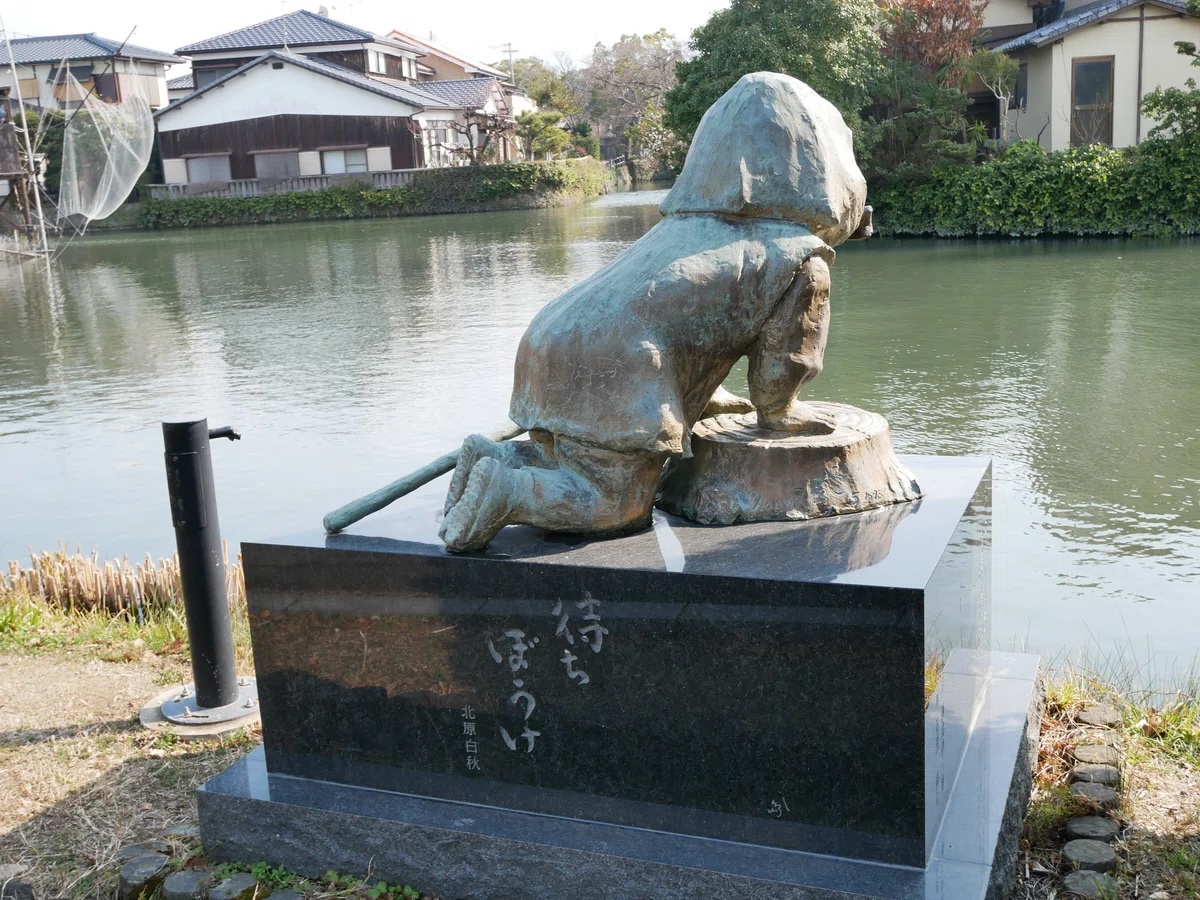 掘割の畔に置かれた「待ちぼうけ」の銅像。ここは童謡「待ちぼうけ」を作詞した童謡作家で歌人でもある北原白秋が育った町。船頭さんが船の上で「待ちぼうけ」を歌う声がここまで届きます。