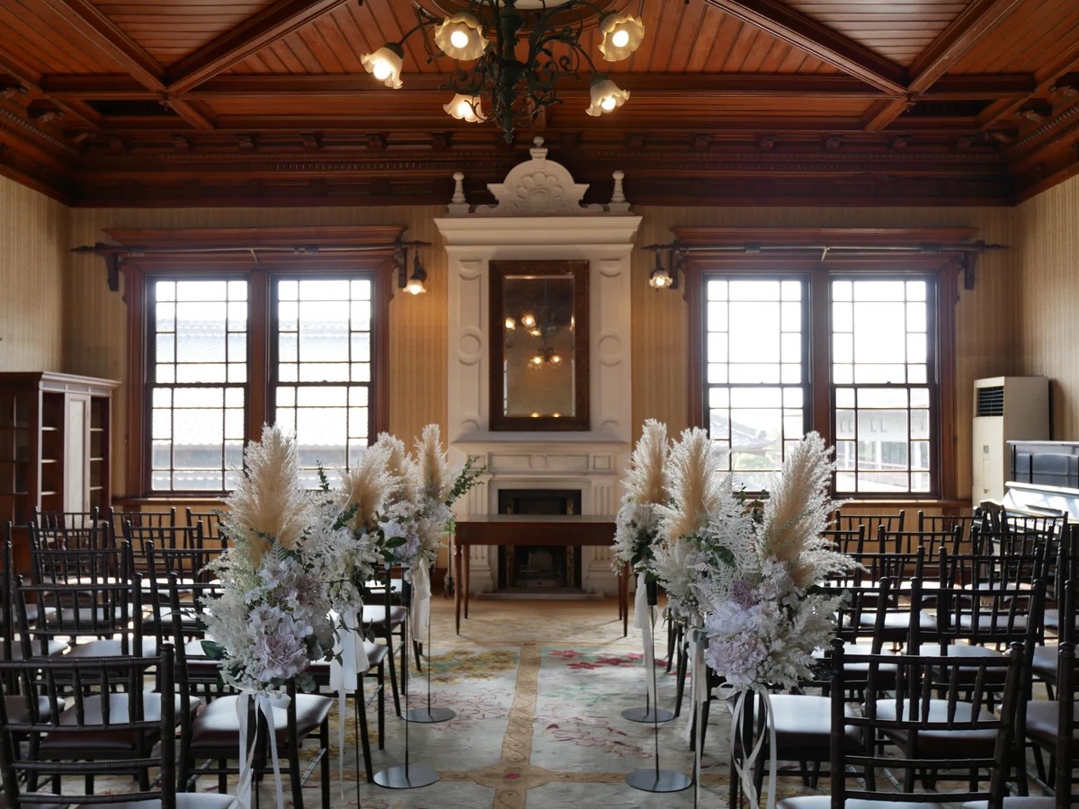洋館では当時の調度品が出迎えてくれて、かつてここに住み生活をしていた人たちの思いを馳せます。ここにも椅子が整然と並べられていて、結婚式を挙げることができるようです。