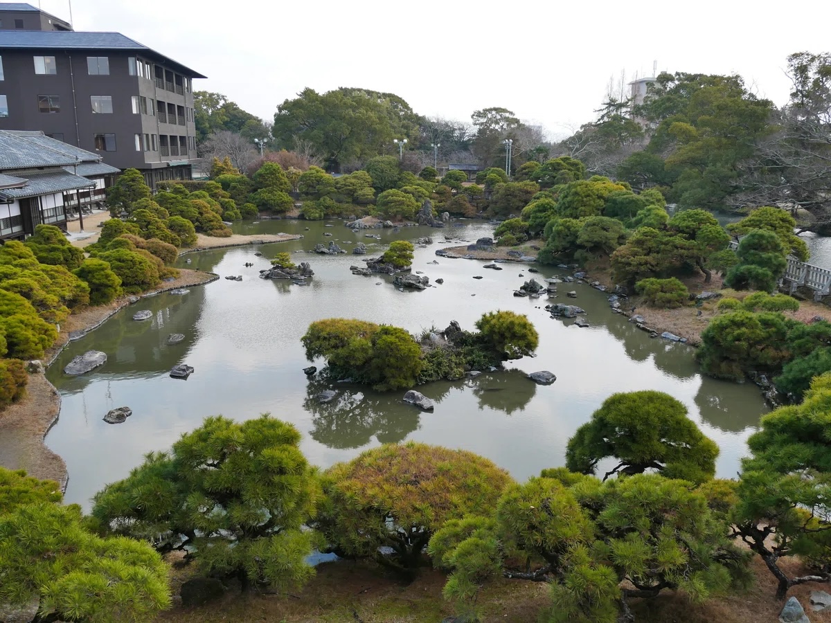 結婚式が行われている大広間の前には松濤園が広がっています。江戸時代初期から作庭された名勝で砂の出島や池の中に松島を模した岩島などが広がります。国の名勝に指定された庭園です。