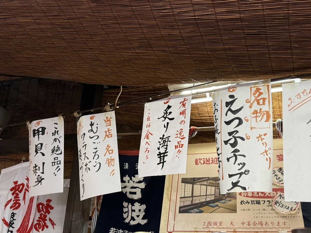 座ったカウンター席の上には聞きなれない魚や海の生き物の名前が並びます。お店の人も気さくな方で「有明海の変な生き物ありますよ!」と声をかけていただきました。ムツゴロウは知っていますが遠浅の有明海には独特の生き物が多くいるようです。