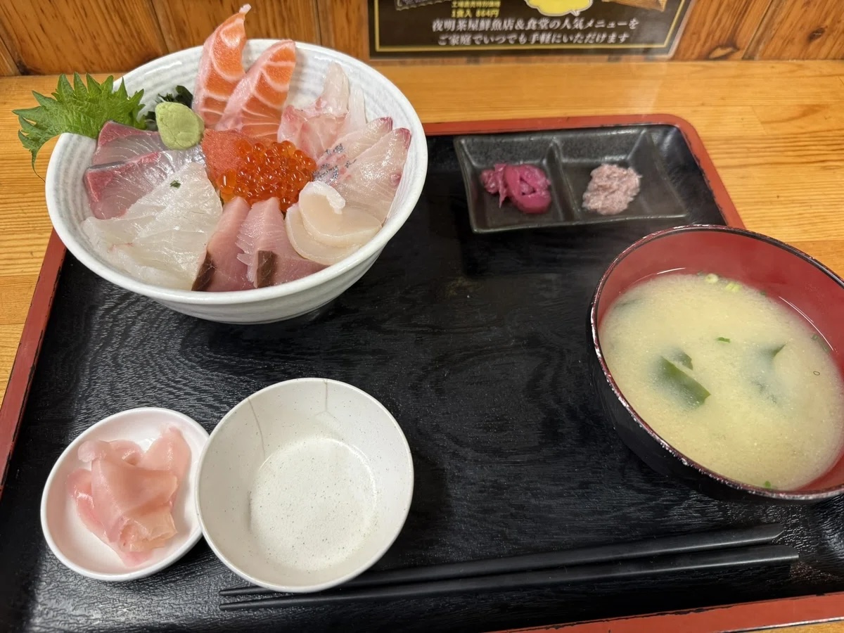 入ったのは御花にほど近い「夜明茶屋」。鮮魚店の奥で食堂を営み、新鮮な海産物を食べることができます。