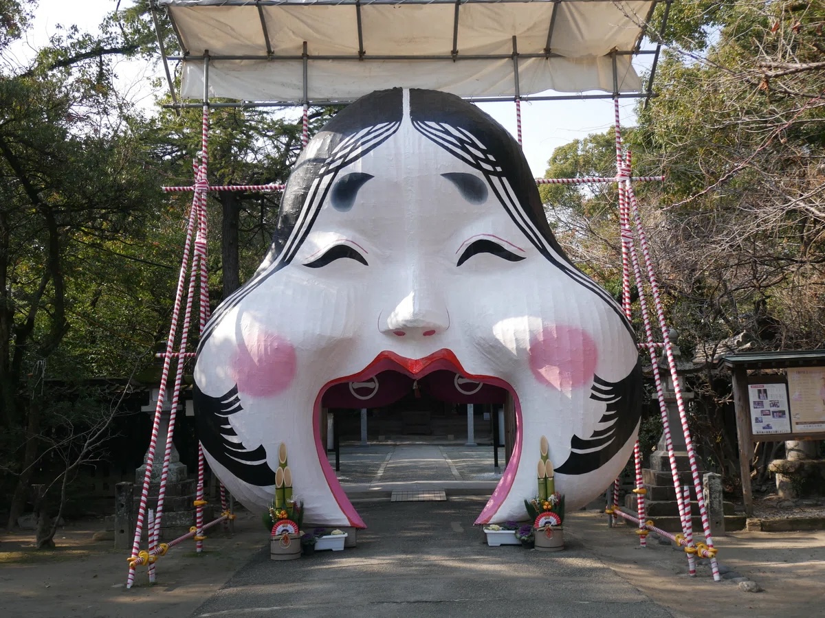 どでかいおかめが出迎える日吉神社。