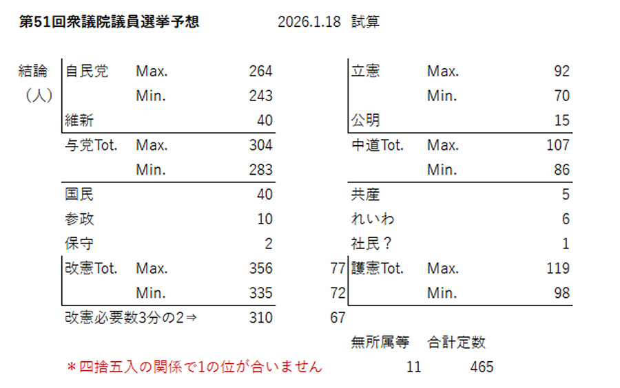 これに筆者は、高市自民に希望の光が差したと直感した。「働いてx5」で諸政策を提示・推進し、国民に希望を与えている高市氏の徳ゆえだと。そこで1月18日、一日掛けて議席予想をした。焦点を高市自民VS中道の議席争いに絞り、どちらに政権担当能力があると有権者が思っているかを占った。