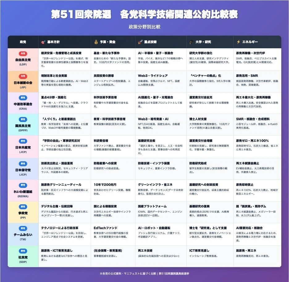 これは、「敵とも話せるSNS(めたべた)」にも参加してくれている一般社団法人「科学・政策と社会研究室」理事の榎木英介氏による各党の科学政策をまとめた表なんですが・・・(榎木氏のXで公開されています)