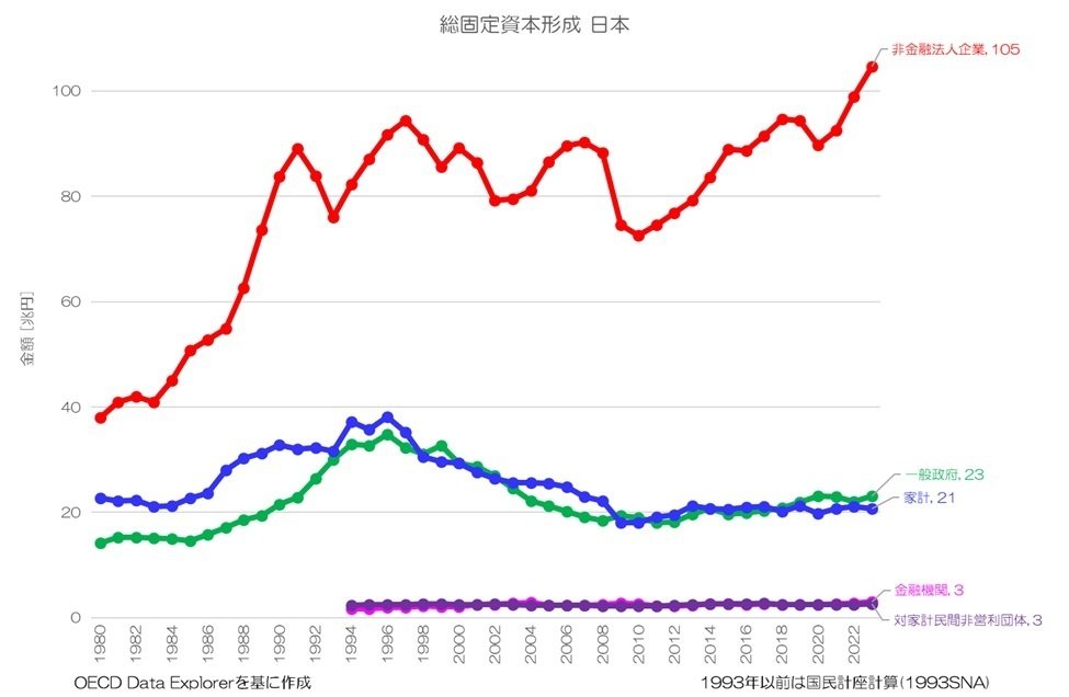 まずは、日本の制度部門別の投資額(総固定資本形成)から確認してきましょう。