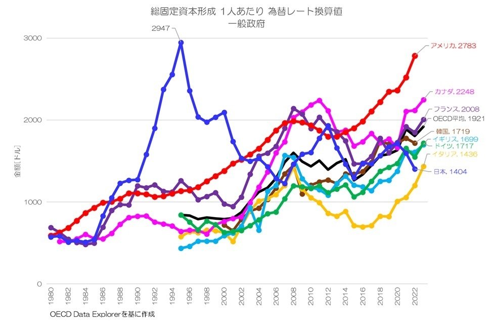 図2が主要先進国における政府の総固定資本形成を人口1人あたりの推移です。