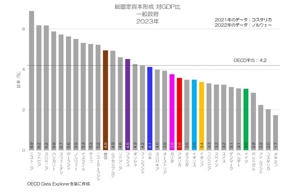先進国の中では、GDPに対する政府の投資割合が中程度ですが、主要先進国の中ではやや高い方となります。