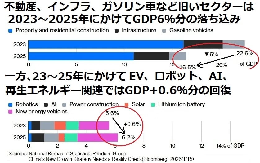 政府が推進する新質生産力(ハイテク製造業)は落ち込む不動産の穴を埋めて、今後の中国経済成長を支える主動力になれるのだろうか。中国経済に強いRhodiumグループは「過去2年、不動産など古いセクターの落ち込みはGDP換算で-6.2%に上るのに対して、EVなど新質生産力セクターは0.6%の伸びしかなく、前者の落ち込みをカバーするほどの力はない」と言う(下図参照)。