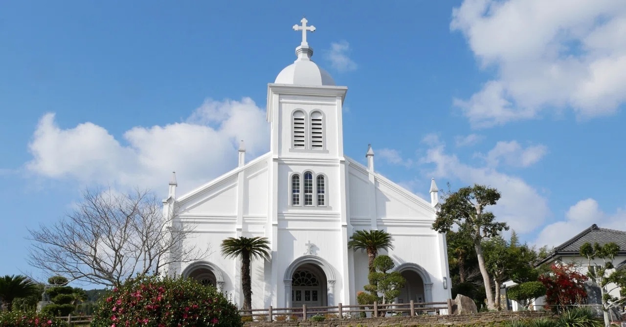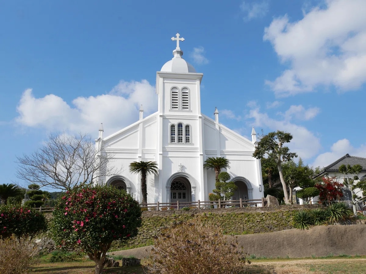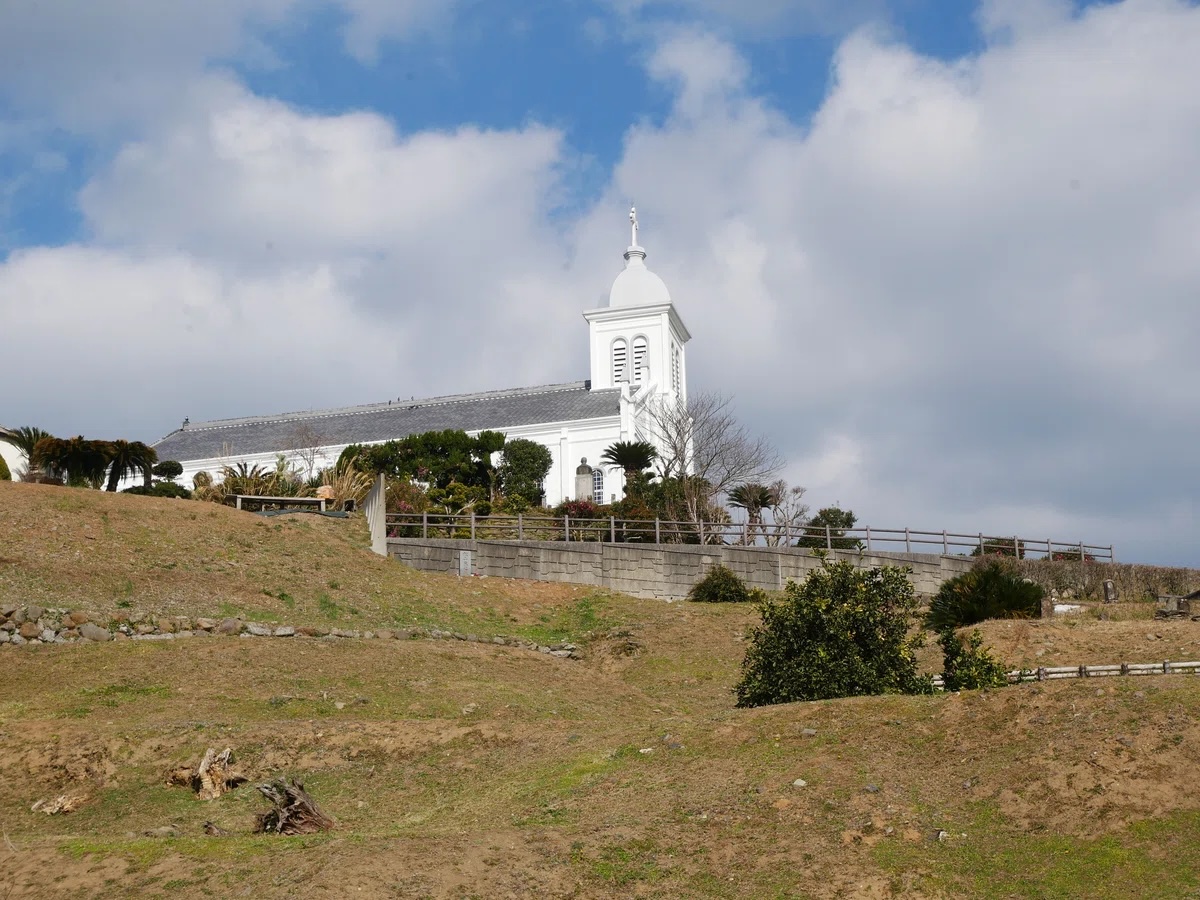 このあと、もうひとつ橋を渡って天草諸島で最も西にある天草下島に入りました。前回のブログで下島の世界遺産、崎津集落の崎津協会を紹介しましたが、そのすぐ近くにもう一つ教会があります。丘の上に建つカトリック大江教会は1933年に建てられました。崎津協会よりも1年早く建てられており、キリスト教解禁後の天草で最も早く建てられた教会です。ロマネスク式の白亜の協会が空に映えて美しいですね。