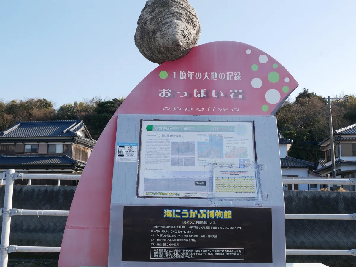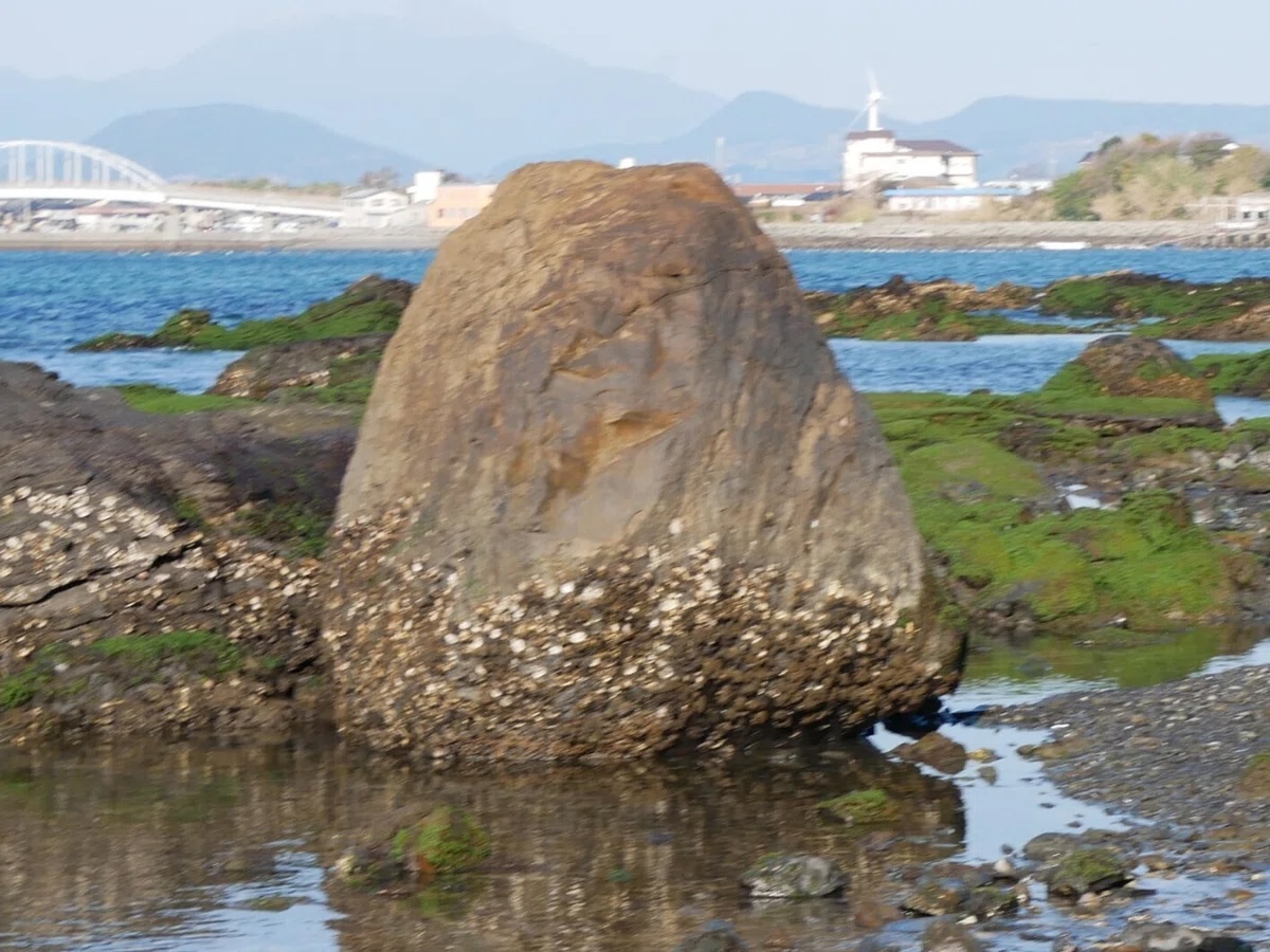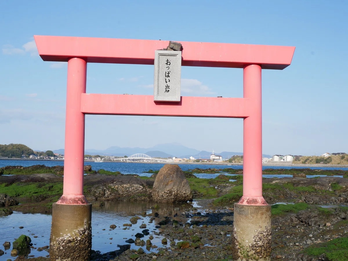 鳥居の向こうにあるのがおっぱい岩。おっぱい岩は雲仙の噴火の際にここまで飛んできたと言われる岩石で、波の浸食によって今のような形になりました。触ると母乳がよく出るようになるといういわれがあり、近年ここに鳥居を建てて崇めるようになっています。