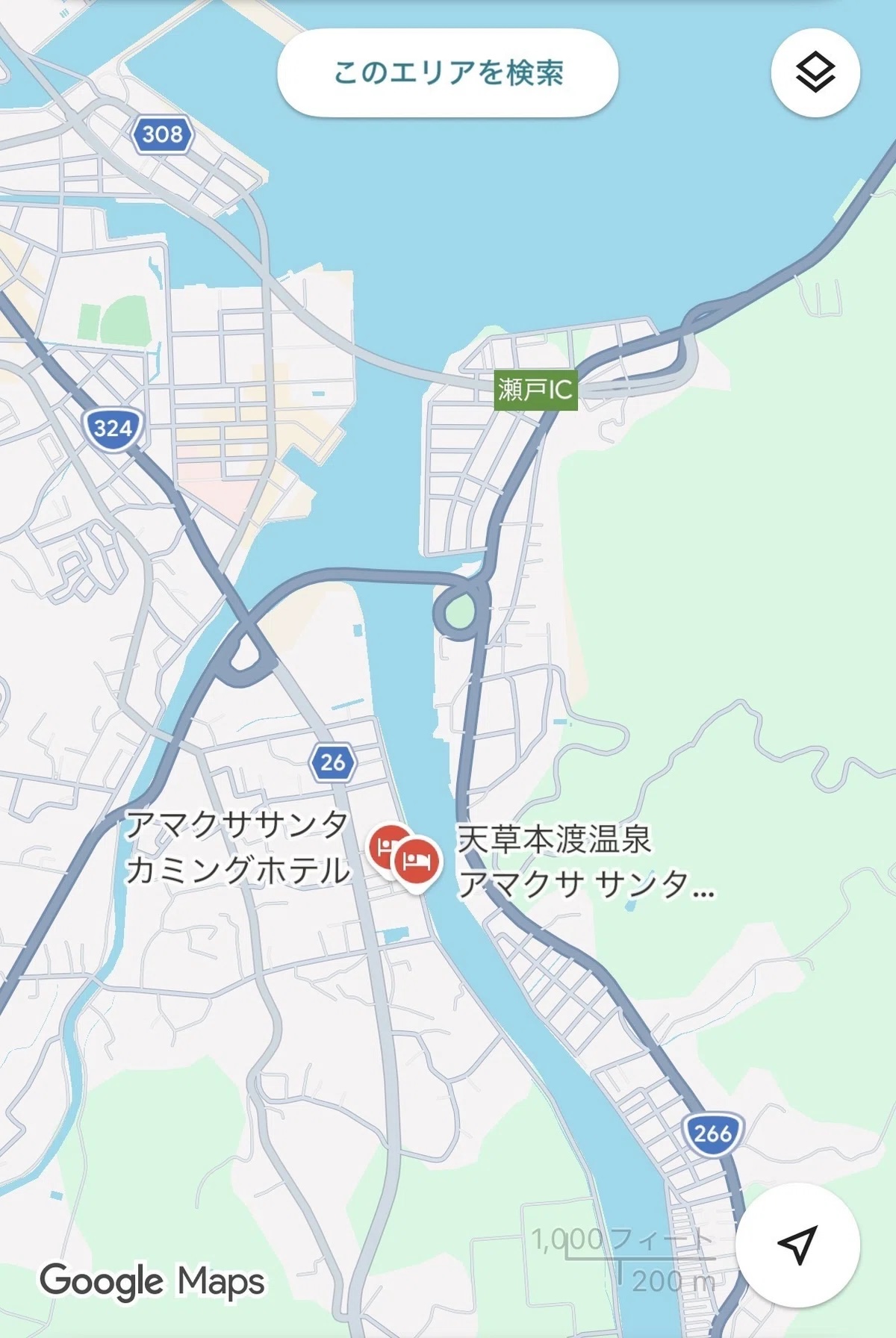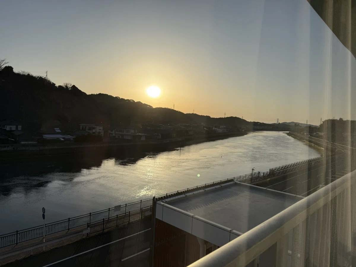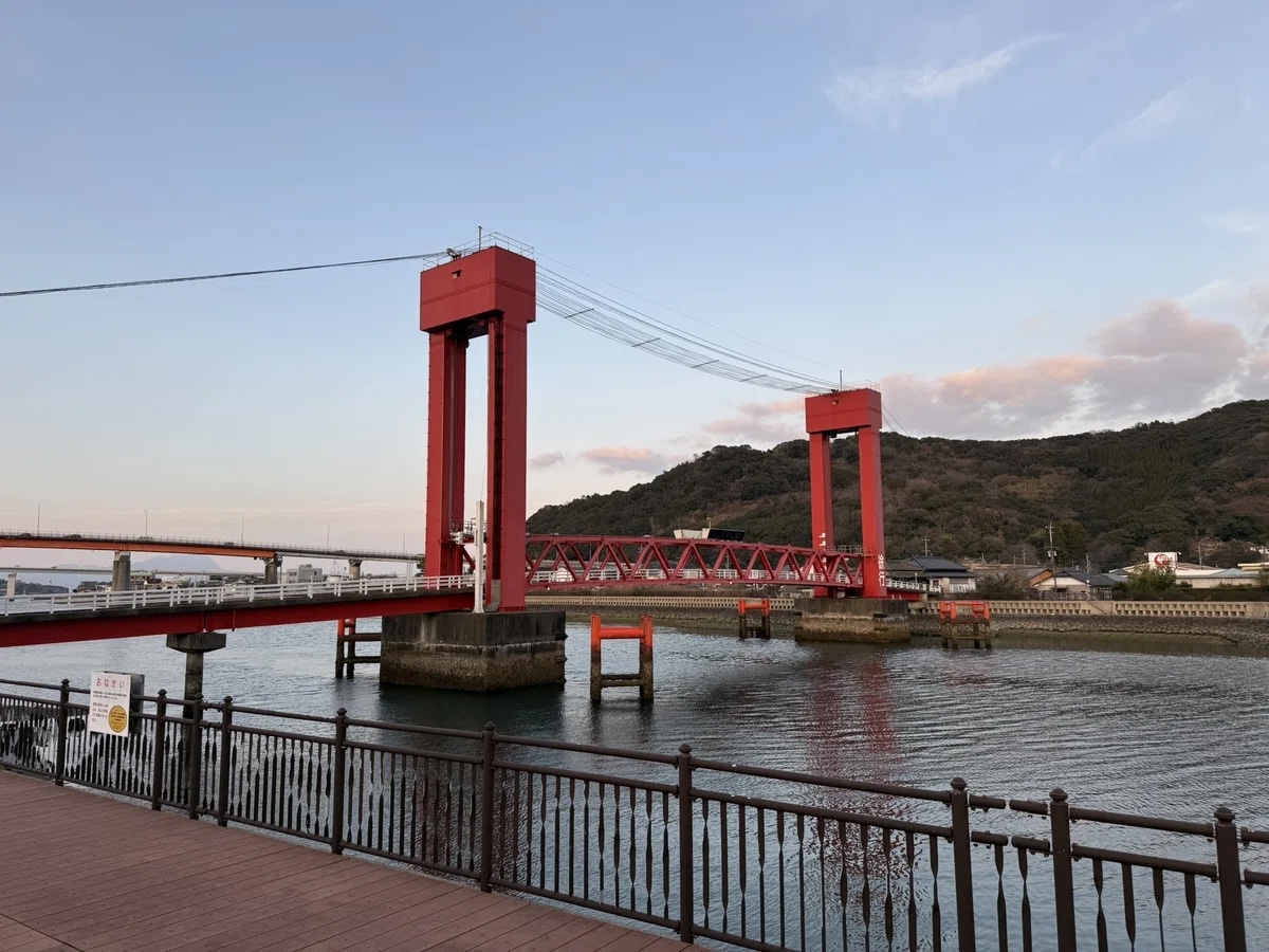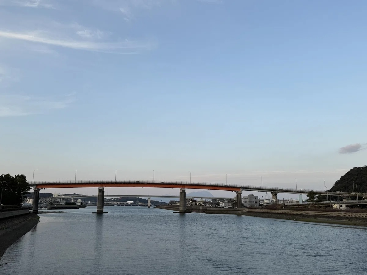 冬の天草をドライブしています。夕暮れ時に少しホテルの周りを散歩しました。ホテルの目に前には川のような水道と、自動車道がかかっているのが見えます。