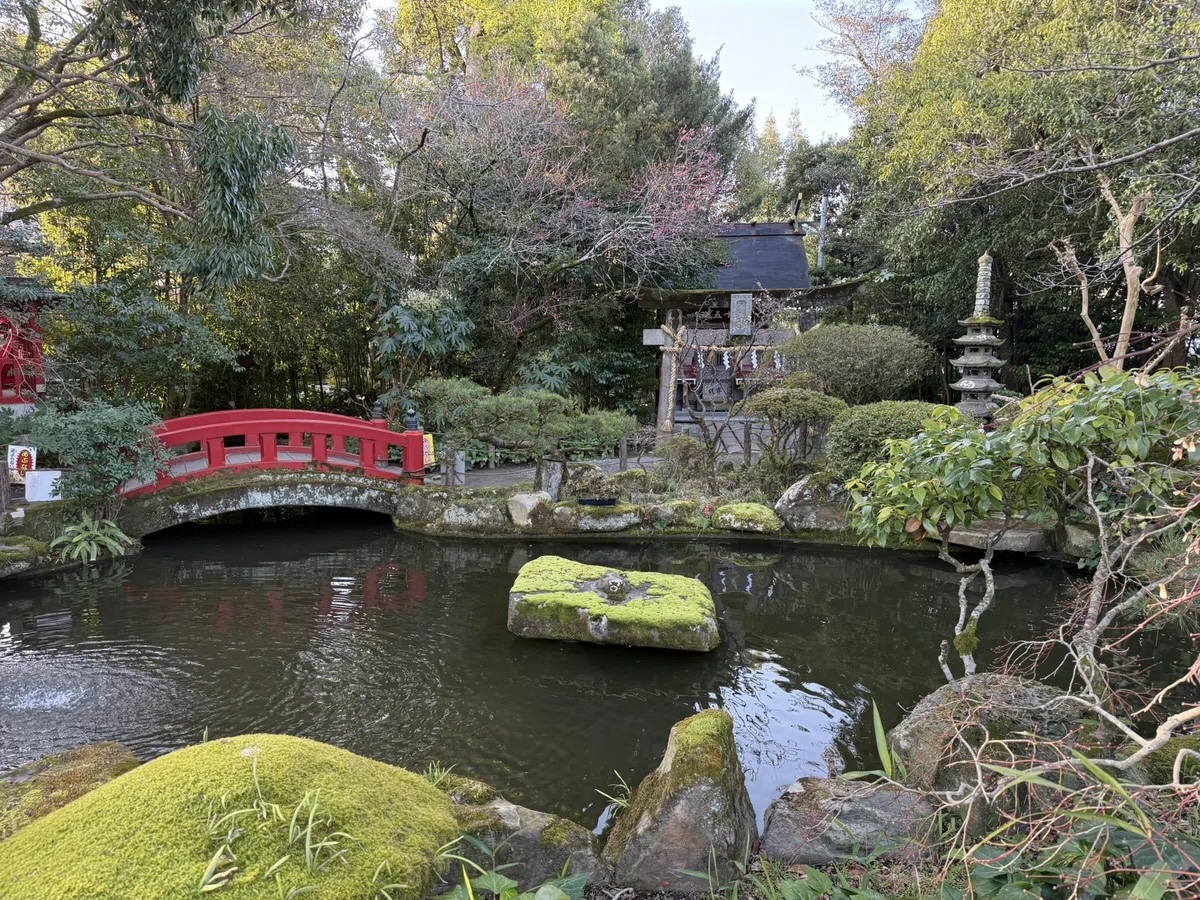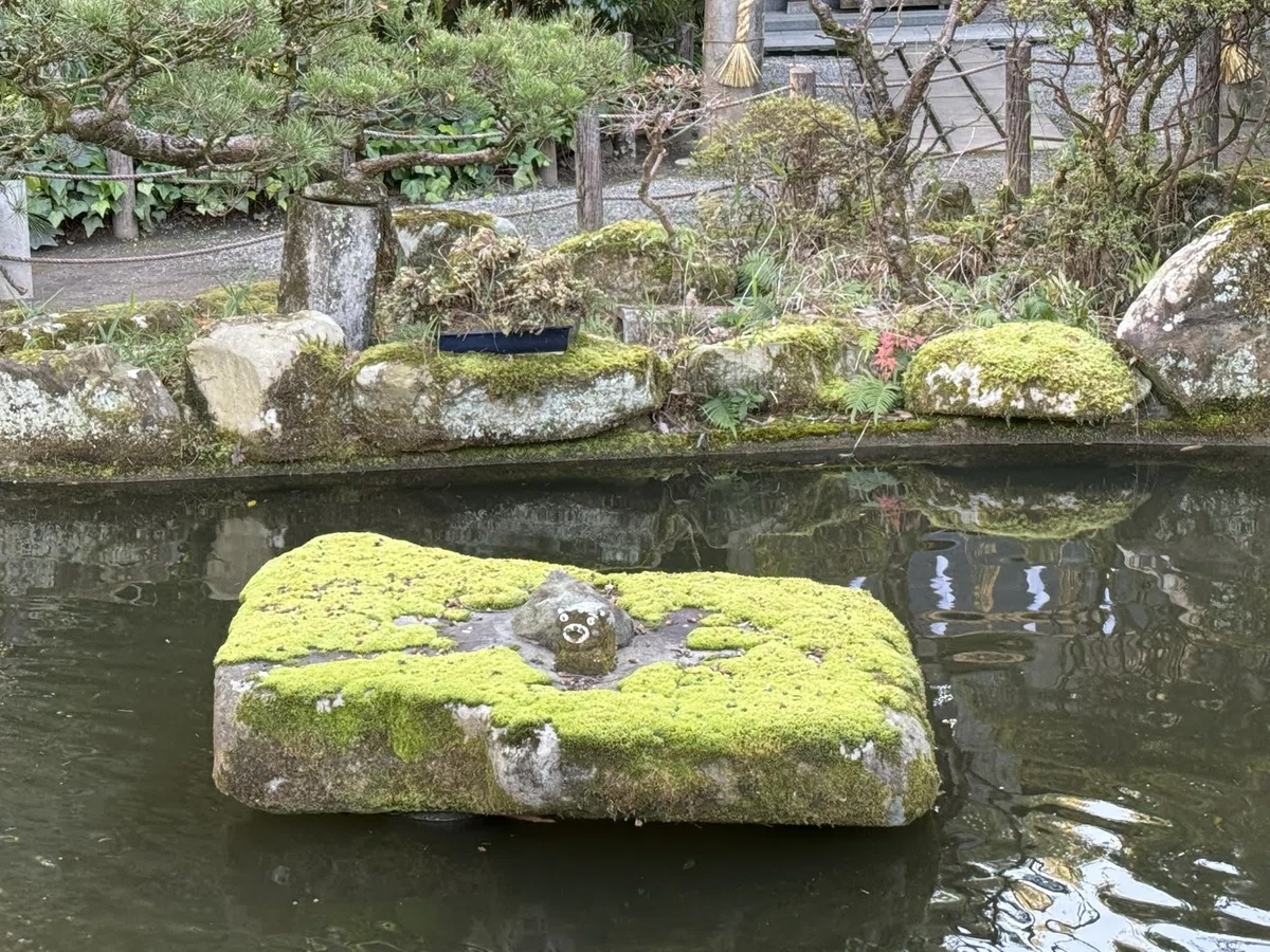 神社の裏手の池は苔がきれいな池になっていますが…池に浮かぶ島になんかいますね?