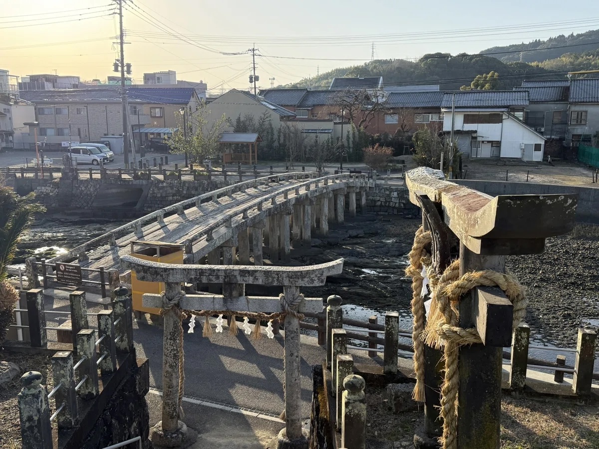神社の外に出て、北に少し歩いたところに古い石橋がありました。今は危険なため渡ることができませんが、こちらは祇園橋といって200年ほど前にかけられました。石橋としては日本最大級のもので、国の指定重要文化財に指定されています。先の島原の乱ではここで幕府軍と一揆勢がぶつかり、大変な死者がでた場所だといいます。