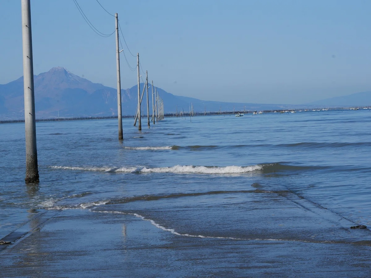 それでもせっかく来たので行けるところまで行ってみました。波が打ち寄せてきて濡れそう。無数の電柱が立つ先にある山は長崎県、島原半島にある雲仙普賢岳と平成新山。平成3年、雲仙普賢岳は198年ぶりに噴火し、火砕流などが発生して大きな災害がでました。平成新山はその活動の際に発生した溶岩ドームの総称です。