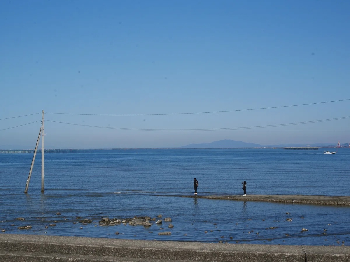 長部田海床路は潮の干満差が激しい有明海に面しています。このため引き潮のときは電柱が続く先のところまで道が現れて歩いて行けるのですが、私が来たのは満ち潮になりつつある時間。そのため、道はかなり手前で海の中に沈んでしまっていました。残念。