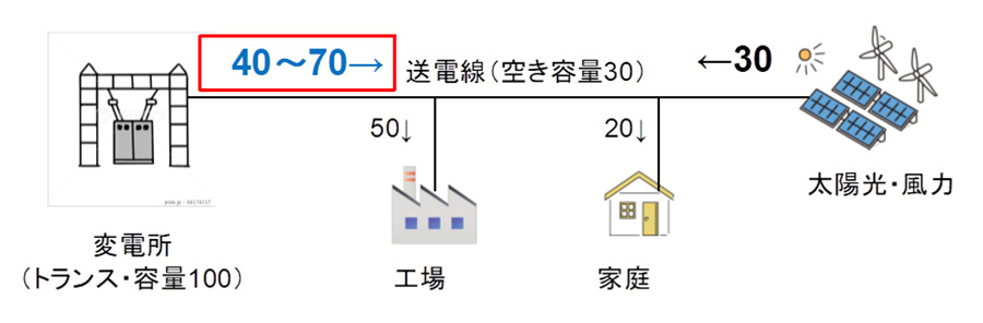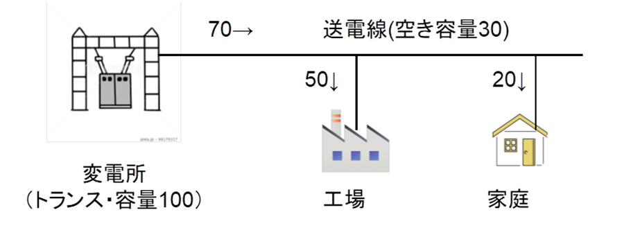 図3は、一般的な変電所から工場や家庭に電気を送電しているイメージである。工場で50、家庭で20の電気を消費した場合、変電所の変圧器および出口部分の送電線には70の電気が流れる。トランスや送電線の容量が100だとすると、余力は30ということになる。データセンターなど新たな供給申込みがあれば、30まではアクセス線の工事のみで供給が可能になる。
