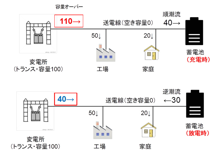 蓄電池を運用する会社が充電時に最大40を希望してきた場合、変電所を流れる電力は110となり、容量オーバーとなる。さらに空き容量が0になるため、データセンターや工場などが受電を希望しても応じられない。変電所の容量増強や、送電線全体を張り替えて容量増強を行わなければならない。